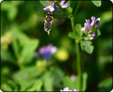 Alfalfa seed production requires the presence of pollinators when the fields of alfalfa are in bloom. Alfalfa pollination is somewhat problematic, however, because Western honey bees, the most commonly used pollinator, are not suitable for this purpose; the pollen-carrying keel of the Alfalfa flower trips and strikes pollinating bees on the head, which helps transfer the pollen to the foraging bee. Western honey bees, however, do not like being struck in the head repeatedly and learn to defeat this action by drawing nectar from the side of the flower. The bees thus collect the nectar but carry no pollen and so do not pollenate the next flower they visit.[2] Because older, experienced bees don't pollinate alfalfa well, most pollination is accomplished by young bees that have not yet learned the trick of robbing the flower without tripping the head-knocking keel. When western honey bees are used to pollinate alfalfa, the beekeeper stocks the field at a very high rate to maximize the number of young bees.