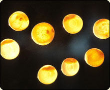 In order to lay her roe, the female salmon uses her tail (caudal fin), to create a low pressure zone, lifting gravel to be swept downstream, excavating a shallow depression, called a redd. The redd may sometimes contain 5,000 eggs covering 30 square feet (2.8 m2).[1] The eggs usually range from orange to red in color. One or more males will approach the female in her redd, depositing his sperm, or milt, over the roe.[2] The female then covers the eggs by disturbing the gravel at the upstream edge of the depression before moving on to make another redd. The female will make as many as 7 redds before her supply of eggs is exhausted. The salmon will then die within a few days of spawning.[2]